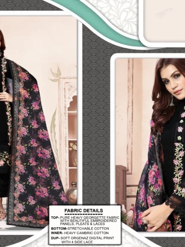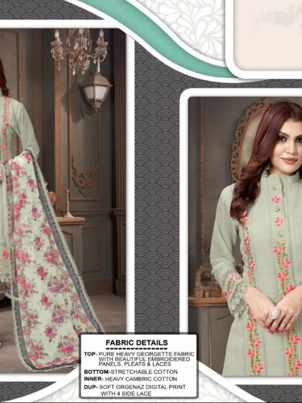 BlackGreyLight Green+2PeachWhitePure heavy Georgette Fabric with beautiful, embroidered panel pleats and lace
